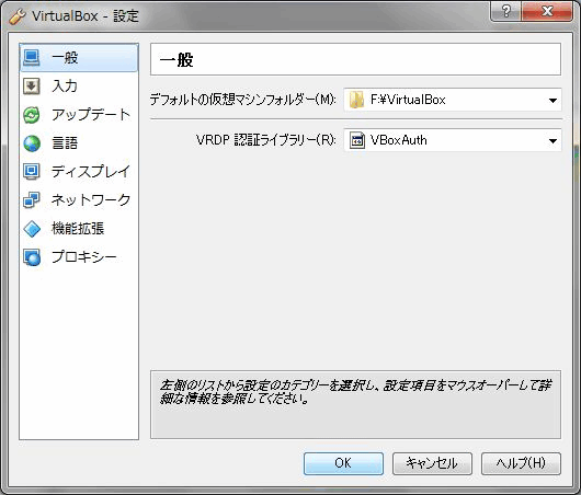 | 保存フォルダ | 作成する仮想マシンの構成データ(vboxファイル)および、仮想マシンイメージ(vdiファイル)が保存されるフォルダ。保存フォルダのドライブの残ディスク容量が少ない場合は、他のドライブを指定しておいた方が良いでしょう。 | %HOME%\VirtualBox VMs または %HOMEDRIVE%%HOMEPATH%\VirtualBox VMs | F:\仮想マシン\VirtualBox |