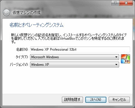 仮想マシンの名前および、ゲストOSを指定します。ゲストOSの指定により、最適なハードディスク、メモリなどのデフォルト値が設定されます。ここでは、ゲストOSとしてWindows XPを選択しています。