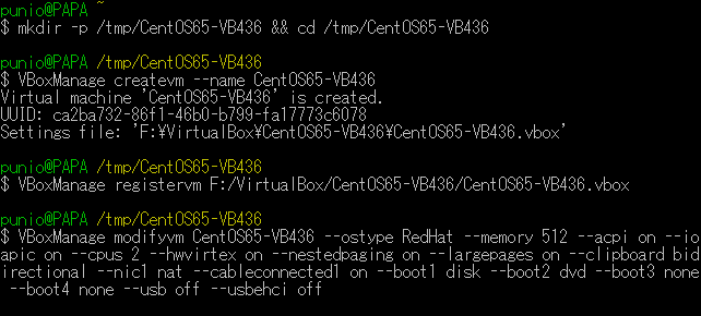 $ mkdir -p /tmp/CentOS65-VB436 && cd /tmp/CentOS65-VB436 $ VBoxManage createvm --name CentOS65-VB436 $ VBoxManage registervm F:/VirtualBox/CentOS65-VB436/CentOS65-VB436.vbox $ VBoxManage modifyvm CentOS65-VB436 --ostype RedHat --memory 512 --acpi on --ioapic on --cpus 2 --hwvirtex on --nestedpaging on --largepages on --clipboard bidirectional --nic1 nat --cableconnected1 on --boot1 disk --boot2 dvd --boot3 none --boot4 none --usb off --usbehci off $ VBoxManage createhd --size 8192 --variant Fixed --filename F:/VirtualBox/CentOS65-VB436/CentOS65-VB436.vdi $ VBoxManage storagectl CentOS65-VB436 --name SATA --add sata --portcount 5 --bootable on $ VBoxManage storageattach CentOS65-VB436 --storagectl SATA --port 1 --type hdd --medium F:/VirtualBox/CentOS65-VB436/CentOS65-VB436.vdi $ VBoxManage storageattach CentOS65-VB436 --storagectl SATA --port 2 --type dvddrive --medium I:/ISO/CentOS/CentOS-6.5-i386-minimal.iso $ VBoxManage startvm CentOS65-VB436