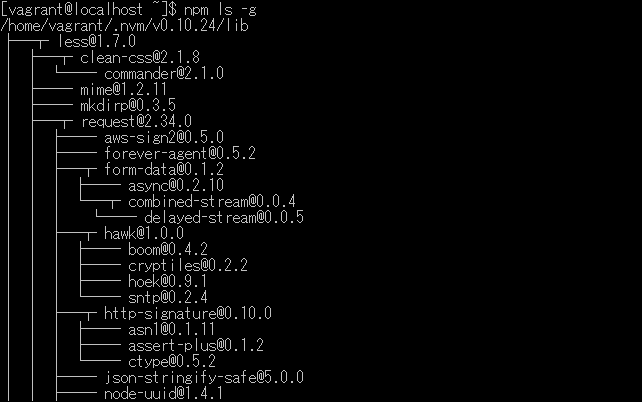 /home/vagrant/.nvm/v0.10.24/lib ├─┬ less@1.7.0 │ ├─┬ clean-css@2.1.8 │ │ └── commander@2.1.0 │ ├── mime@1.2.11 │ ├── mkdirp@0.3.5 │ ├─┬ request@2.34.0 │ │ ├── aws-sign2@0.5.0 │ │ ├── forever-agent@0.5.2 │ │ ├─┬ form-data@0.1.2 │ │ │ ├── async@0.2.10 │ │ │ └─┬ combined-stream@0.0.4 │ │ │ └── delayed-stream@0.0.5 │ │ ├─┬ hawk@1.0.0 │ │ │ ├── boom@0.4.2 │ │ │ ├── cryptiles@0.2.2 │ │ │ ├── hoek@0.9.1 │ │ │ └── sntp@0.2.4 │ │ ├─┬ http-signature@0.10.0 │ │ │ ├── asn1@0.1.11 │ │ │ ├── assert-plus@0.1.2 │ │ │ └── ctype@0.5.2 │ │ ├── json-stringify-safe@5.0.0 │ │ ├── node-uuid@1.4.1 │ │ ├── oauth-sign@0.3.0 │ │ ├── qs@0.6.6 │ │ ├─┬ tough-cookie@0.12.1 │ │ │ └── punycode@1.2.4 │ │ └── tunnel-agent@0.3.0 │ └─┬ source-map@0.1.33 │ └── amdefine@0.1.0 └─┬ npm@1.3.21 ├── abbrev@1.0.4 ├── ansi@0.2.1 ├── ansicolors@0.3.2 ├── ansistyles@0.1.3 ├── archy@0.0.2 ├── block-stream@0.0.7 ├── child-process-close@0.1.1 ├── chmodr@0.1.0 ├── chownr@0.0.1 ├── cmd-shim@1.1.1 ├── editor@0.0.5 ├── fstream@0.1.25 ├─┬ fstream-npm@0.1.6 │ └── fstream-ignore@0.0.7 ├── github-url-from-git@1.1.1 ├── github-url-from-username-repo@0.0.2 ├── glob@3.2.7 ├── graceful-fs@2.0.1 ├── inherits@2.0.1 ├── ini@1.1.0 ├─┬ init-package-json@0.0.14 │ └── promzard@0.2.0 ├── lockfile@0.4.2 ├── lru-cache@2.5.0 ├─┬ minimatch@0.2.14 │ └── sigmund@1.0.0 ├── mkdirp@0.3.5 ├── node-gyp@0.12.1 ├── nopt@2.1.2 ├─┬ npm-registry-client@0.3.2 │ └── couch-login@0.1.19 ├── npm-user-validate@0.0.3 ├─┬ npmconf@0.1.9 │ └─┬ config-chain@1.1.8 │ └── proto-list@1.2.2 ├── npmlog@0.0.6 ├── once@1.3.0 ├── opener@1.3.0 ├── osenv@0.0.3 ├── path-is-inside@1.0.0 ├─┬ read@1.0.5 │ └── mute-stream@0.0.4 ├── read-installed@0.2.5 ├─┬ read-package-json@1.1.4 │ └── normalize-package-data@0.2.7 ├─┬ request@2.30.0 │ ├── aws-sign2@0.5.0 │ ├── forever-agent@0.5.0 │ ├─┬ form-data@0.1.2 │ │ ├── async@0.2.9 │ │ └─┬ combined-stream@0.0.4 │ │ └── delayed-stream@0.0.5 │ ├─┬ hawk@1.0.0 │ │ ├── boom@0.4.2 │ │ ├── cryptiles@0.2.2 │ │ ├── hoek@0.9.1 │ │ └── sntp@0.2.4 │ ├─┬ http-signature@0.10.0 │ │ ├── asn1@0.1.11 │ │ ├── assert-plus@0.1.2 │ │ └── ctype@0.5.2 │ ├── json-stringify-safe@5.0.0 │ ├── mime@1.2.11 │ ├── node-uuid@1.4.1 │ ├── oauth-sign@0.3.0 │ ├── qs@0.6.6 │ ├─┬ tough-cookie@0.9.15 │ │ └── punycode@1.2.3 │ └── tunnel-agent@0.3.0 ├── retry@0.6.0 ├── rimraf@2.2.5 ├── semver@2.2.1 ├─┬ sha@1.2.3 │ └── readable-stream@1.0.17 ├── slide@1.1.5 ├── tar@0.1.19 ├── text-table@0.2.0 ├── uid-number@0.0.3 └── which@1.0.5