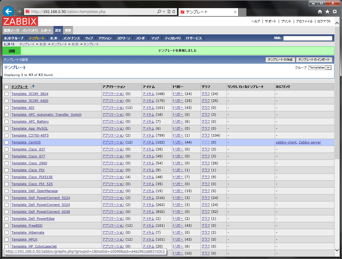 テンプレートの修正を含む全ての作業は、Zabbixサーバーの管理画面で行います。