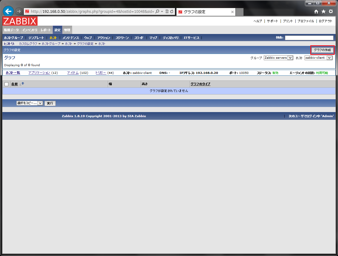 Zabbixでは、監視対象として追加したサーバーのグラフの作成テンプレートが登録されません。このため、テンプレートまたは、ホストごとにグラフ作成を行います。ここでは、ホストにグラフを登録しています。