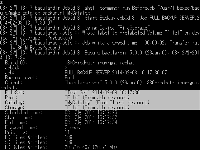 Consoleに表示されたログ上で、実行したCatalog/Storage/Pool/FileSetなどが確認できます。