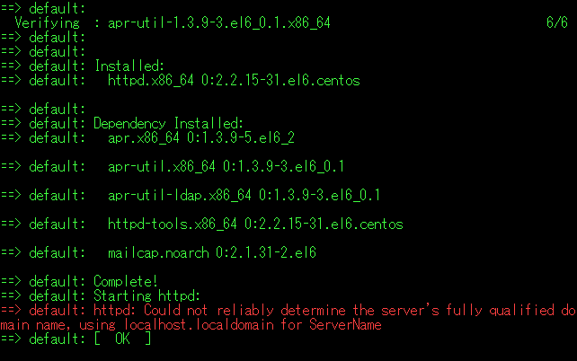 ==> default: httpd: Could not reliably determine the server's fully qualified domain name, using localhost.localdomain for ServerName