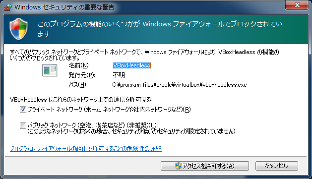 なお、起動中にWindowsファイアウォールの警告ダイアログが表示されることがありますので、アクセスを許可するをクリックして、VirtualBox関連のプログラムのアクセスを許可します。